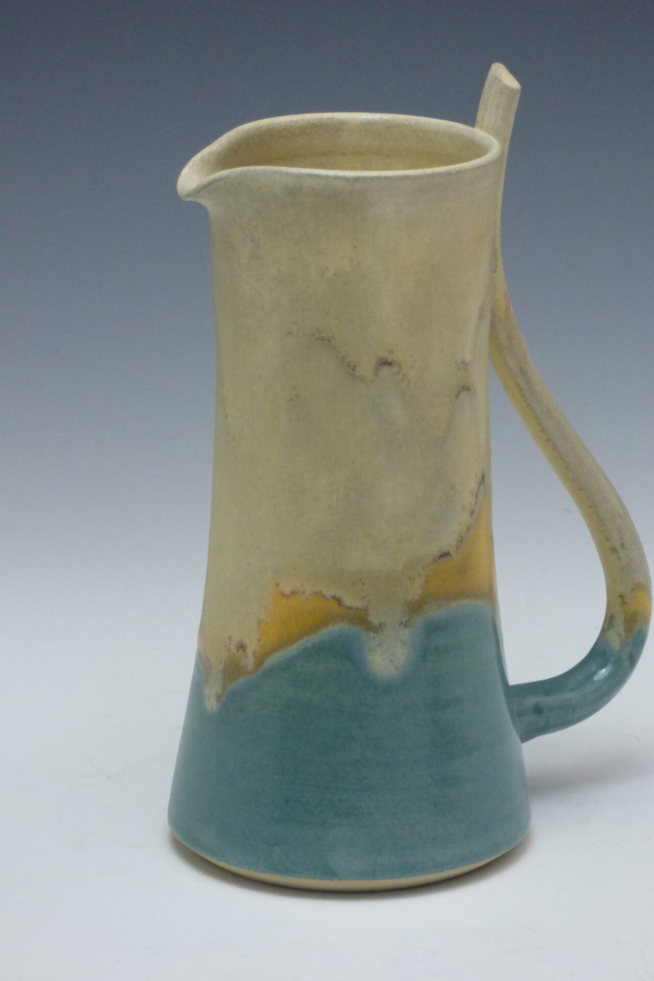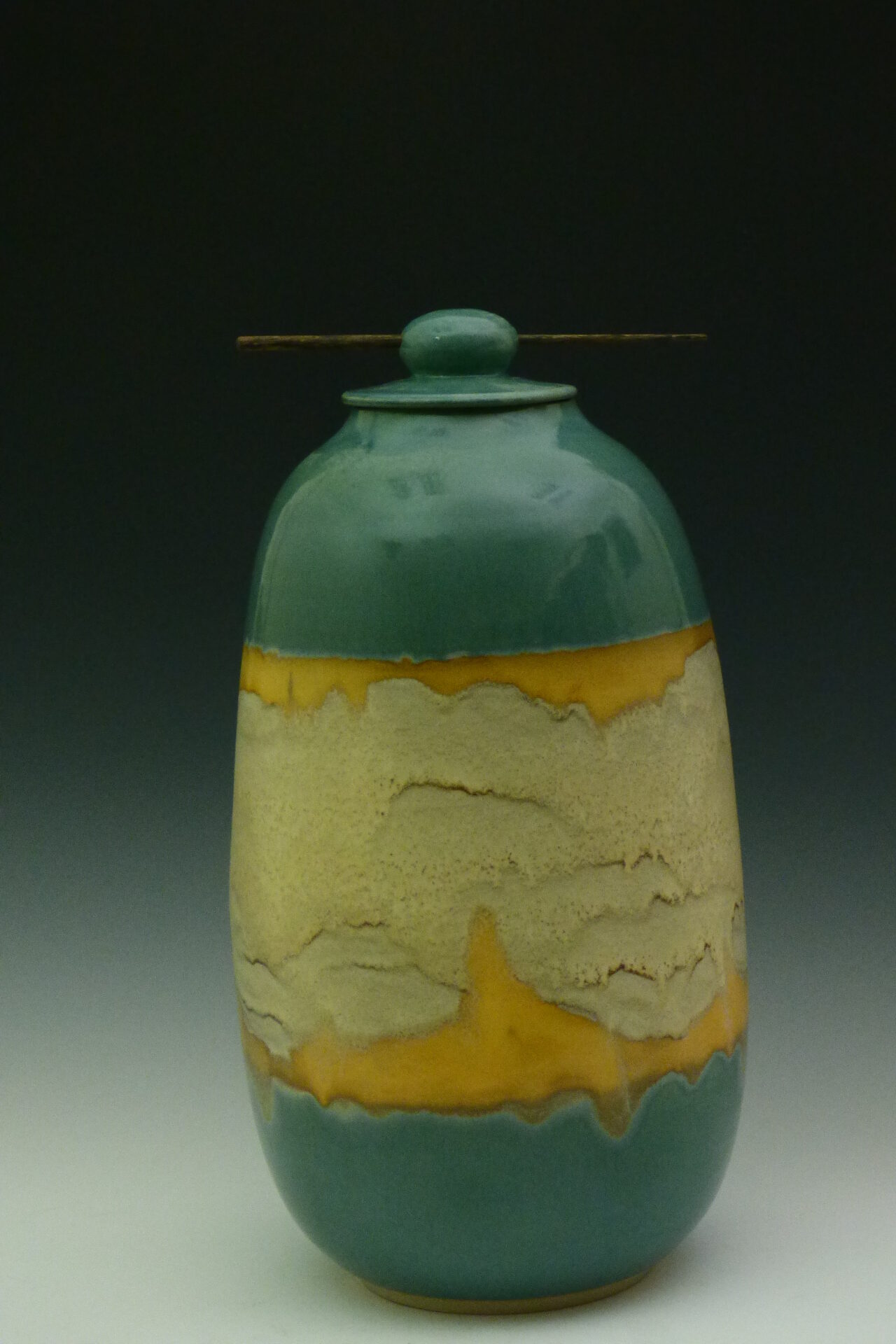 « Mes années de tournage m’ont dirigé vers le grès pour sa souplesse et sa fiabilité. Cuite autour de 1300°, sa solidité permet une utilisation courante dans l’art de la table. Des lignes sobres et tendues font les formes que j’aime ». Epurées, après une première cuisson biscuit, elles sont prêtes à recevoir la composition de mes émaux : vert, bleu ou jaune sous un veinage de sable ton pierre. Une autre gamme de couleur plus chaude et profonde existe, à base de rouge de fer qui laisse apparaître une terre brune calligraphiée.s avons laissé une trace. Une petite trace d’humanité.