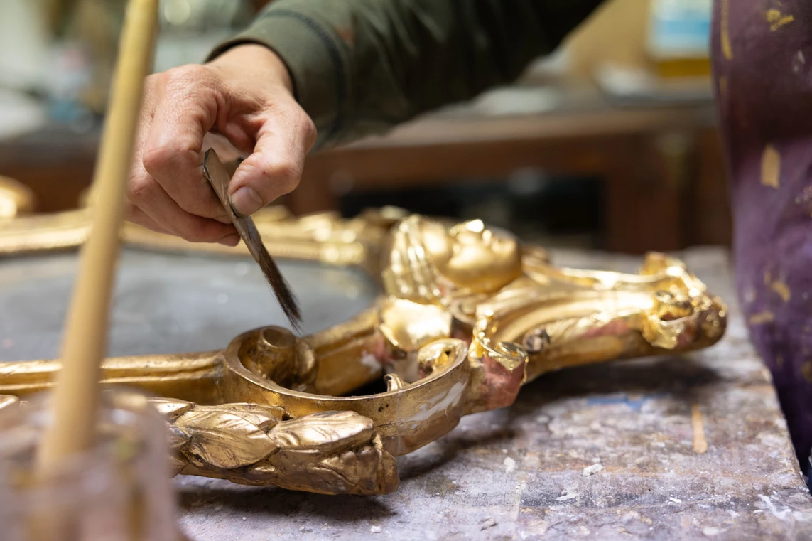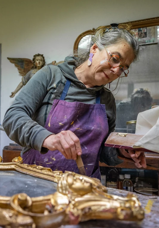 Dans son atelier « La Pie Dorée », elle pratique l’art traditionnel de la dorure à la feuille, un savoir-faire transmis depuis des siècles.