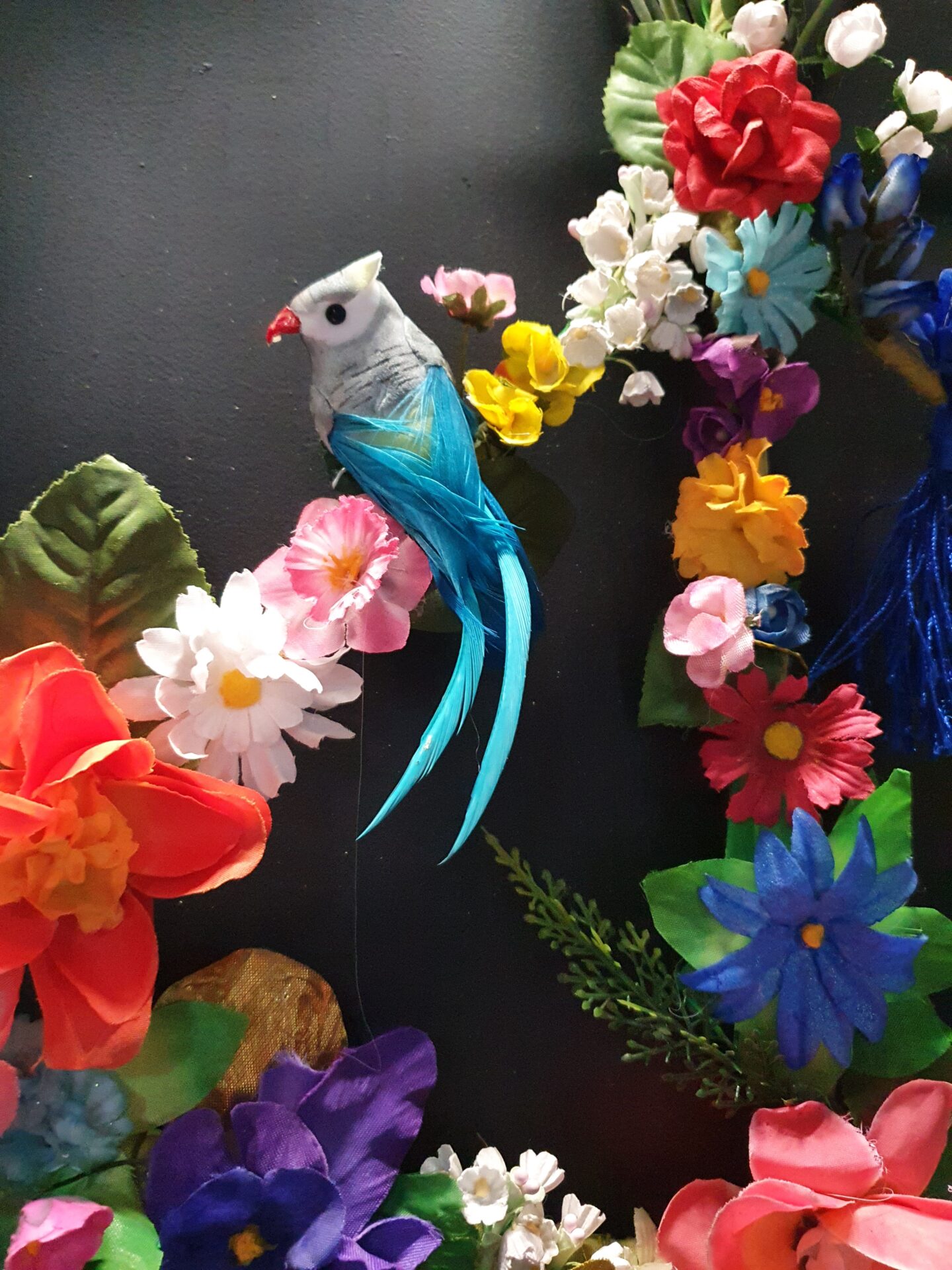 Aucun doute lorsque l’on découvre son atelier. On se croirait dans un jardin merveilleux ! Sur les murs peint en bleu comme le ciel sont exposés des miroirs et des sculptures en papier mâché. Sur les arbres poussent des bijoux, des sacs à mains et des accessoires de mode qu’elle invente de toutes pièces avec des matériaux recyclés. C’est frais, c’est kitch et c’est joli !